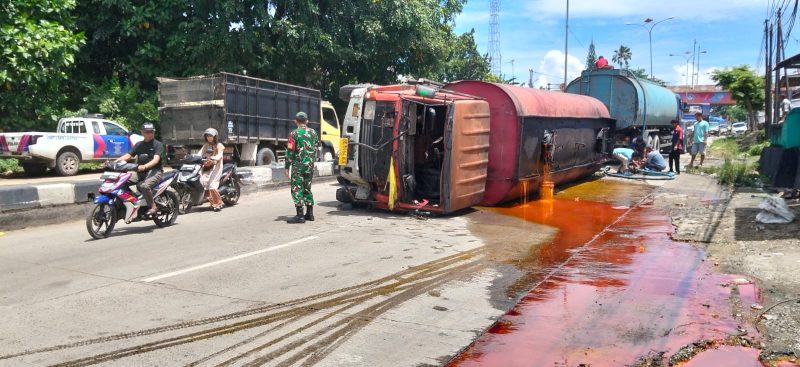 Peristiwa terjadi sekitar pukul 09.30 WIB ketika sebuah truk pengangkut minyak sawit milik PT BW yang dikemudikan Usman (40), warga Gunung Sugih, Lampung Tengah, mengalami kecelakaan setelah berusaha menghindari kendaraan lain.